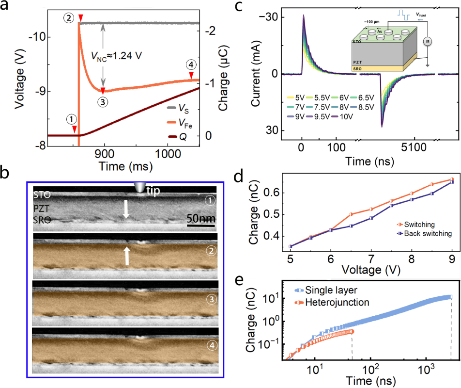 在STO/PZT异质结构研究中,团队观察到界面电荷动态对负电容效应的显著增强作用。界面导电性的变化导致电容器式的全域畴切换,使负电容电压降比单层铁电体提高一个数量级(1.24V),同时表现出无滞后的快速响应特性。这种由界面电荷辅助的极化切换机制,不仅验证了理论预测的"朗道切换"模式,还为设计高性能负电容器件提供了新思路。