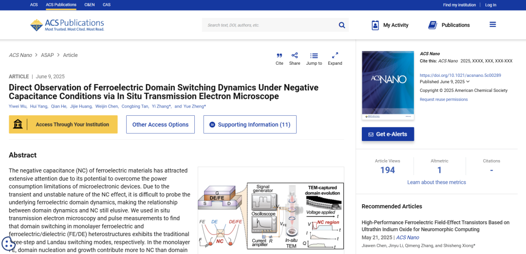 针对上述问题,由中山大学等组成的研究团队利用泽攸科技原位TEM进行了深入研究,该团队通过极化映射技术定量分析了铅原子位移矢量Dpb,揭示了单层铁电体与异质结构完全不同的畴切换机制。这种多学科交叉的研究方法,使得团队能够首次区分本征(畴动力学)和外征(电荷注入)负电容效应的贡献。相关成果以“Direct Observation of Ferroelectric Domain Switching Dynamics Under Negative Capacitance Conditions via In Situ Transmission Electron Microscope”为题发表在《ACS Nano》期刊上。