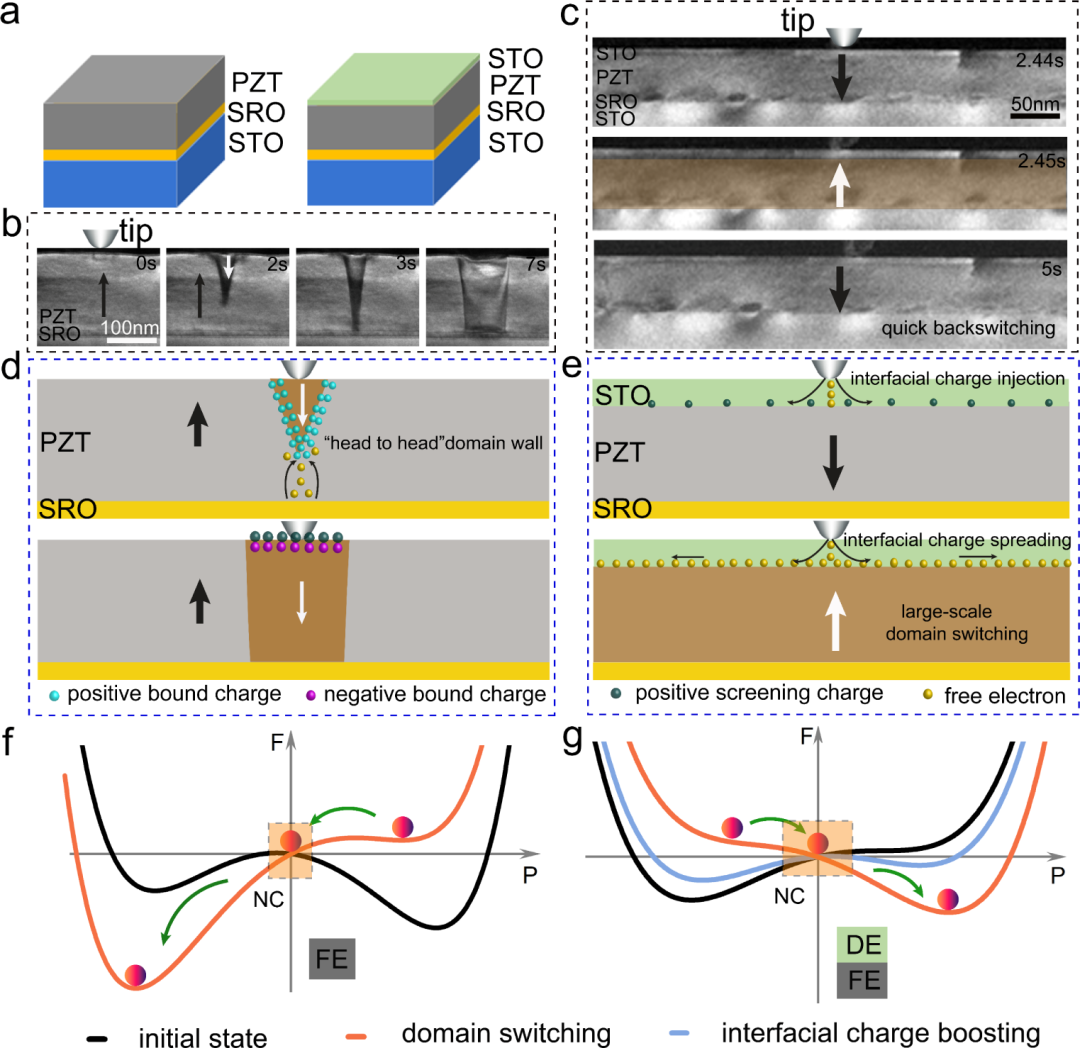 不过传统脉冲测量虽能研究铁电畴动力学,但无法准确获取电极下畴结构的分布与演化信息,难以全面揭示负电容效应与畴动态的关联。此外铁电畴的瞬态切换过程对负电容的贡献机制尚不明确,且极化切换诱导的电荷注入等外源因素的作用也未被充分量化。例如单层铁电体中的“头对头”畴壁运动会导致强退极化场,而STO/PZT异质结构中界面电荷辅助的“朗道切换”模式则表现出无滞后的快速极化翻转特性,但二者对负电容的增强机制差异仍需实验验证,这些问题的存在使得铁电负电容效应的物理本质及其在低功耗器件中的应用潜力仍未被完全挖掘。