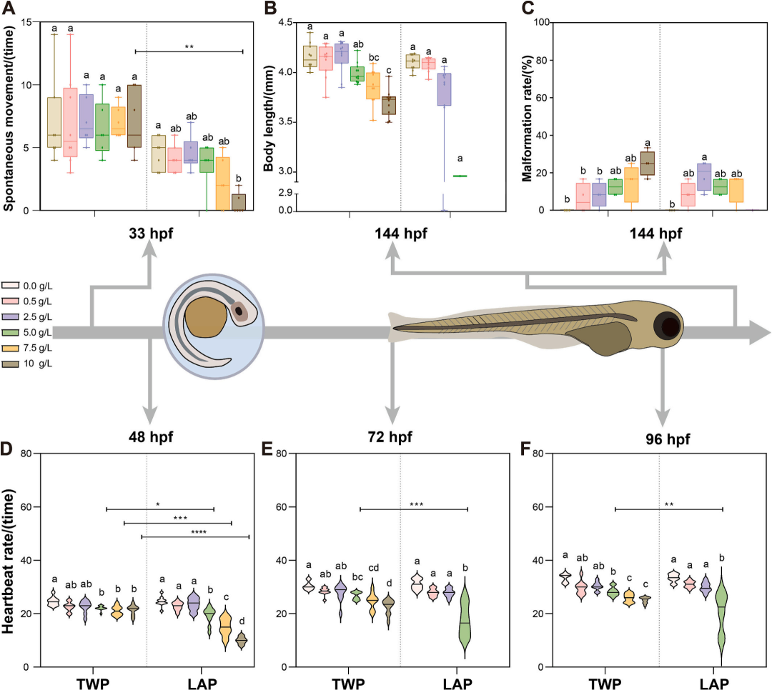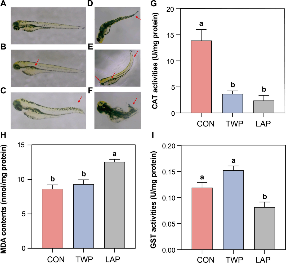 生理毒性评估结果显示,LAP 浸出液的毒性显著强于 TWP:在高浓度下,LAP 导致的死亡率更高、孵化延迟更严重,且胚胎出现更明显的尾部和脊柱弯曲等畸形,对自发运动、心跳速率和体长的抑制作用也更为突出;相比之下,TWP 浸出液的毒性效应相对较弱,在相同浓度下对胚胎的损伤程度较低。氧化应激检测表明,LAP 暴露引发的丙二醛(MDA)水平升高和谷胱甘肽 S - 转移酶(GST)活性降低更为显著,显示其造成的氧化损伤和解毒系统 impairment 更严重;而 TWP 暴露则呈现出一定的适应性抗氧化反应。