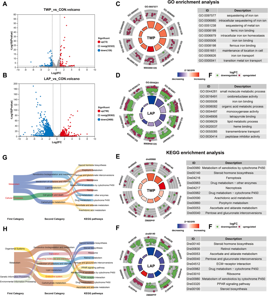 该论文以斑马鱼胚胎为研究模型,深入探究了轮胎磨损颗粒(TWP)和乳胶颗粒(LAP)浸出液的环境毒性及其作用机制。研究通过设置0、0.5、2.5、5、7.5和10g/L等不同浓度的浸出液,对斑马鱼胚胎进行为期5天的暴露处理,综合运用生理指标监测、氧化应激标志物检测、转录组分析及功能拯救实验等方法,系统比较了两种颗粒浸出液的毒性差异,并揭示了其潜在的分子机制。