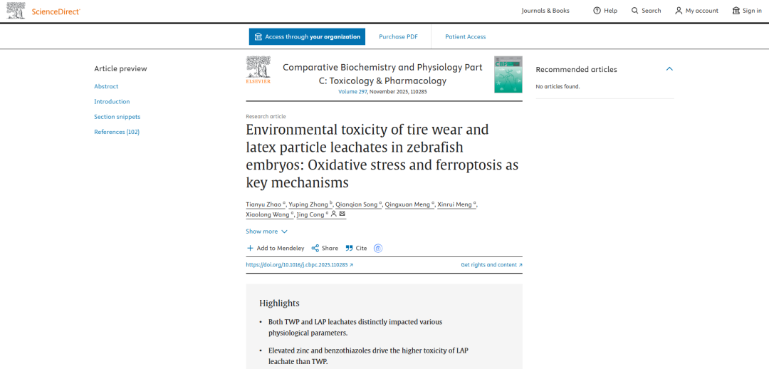尽管 TWP 和 LAP 在环境中的存在已被证实,但当前研究仍存在诸多不足。一方面,对两者的浸出特性及其对水生生物的毒理效应缺乏全面系统的认知,尤其是 LAP 的水生毒性研究明显滞后,其与 TWP 在毒性强度和机制上的差异尚未明确。另一方面,现有研究对微橡胶浸出液导致毒性的分子机制解析不足,例如氧化应激、铁死亡等潜在通路在 TWP 和 LAP 毒性中的具体作用及差异尚未厘清。此外,虽然已有研究关注到 TWP 和 LAP 中含有的重金属(如锌)和有机化合物(如苯并噻唑衍生物)可能参与毒性过程,但这些成分如何协同作用并导致不同毒性效应的细节仍有待深入探究。这些研究空白使得无法准确评估 TWP 和 LAP 的环境风险,也制约了针对性管控措施的制定。