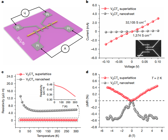 针对上述问题,由北京航空航天大学联合休斯顿大学等组成的团队,利用泽攸科技原位TEM测量系统进行了深入研究,该团队通过刚度调节的卷曲策略成功构建了具有层间氢键结合的碳化物和碳氮化物非范德华超晶格,实现了30000 S cm⁻¹超高电导率和124dB卓越电磁屏蔽性能,这一突破性成果发表于国际顶级期刊《Nature》,彰显了该研究的科学价值与创新高度。