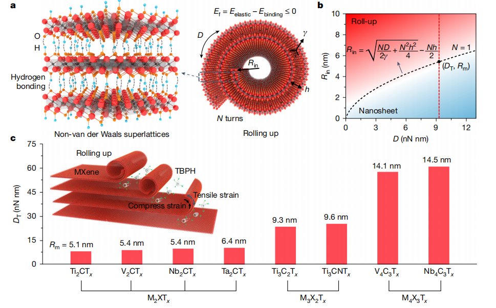 研究团队成功开发了一种基于刚度调节卷曲策略的合成方法,实现了碳化物和碳氮化物非范德华超晶格的构建。该方法的核心在于通过在MX层中创建金属空位来定制原子层的弯曲刚度,从而在四丁基膦氢氧化物(TBPH)等高效剥离剂作用下触发原子层的有序卷曲。与传统范德华超晶格不同,这种新型结构通过层间氢键结合,实现了强界面电子耦合。目前已成功制备17种不同组成的MXene超晶格,包括V、Ti、Nb和Ta基碳化物和碳氮化物,为人工堆叠体系提供了丰富的材料平台。